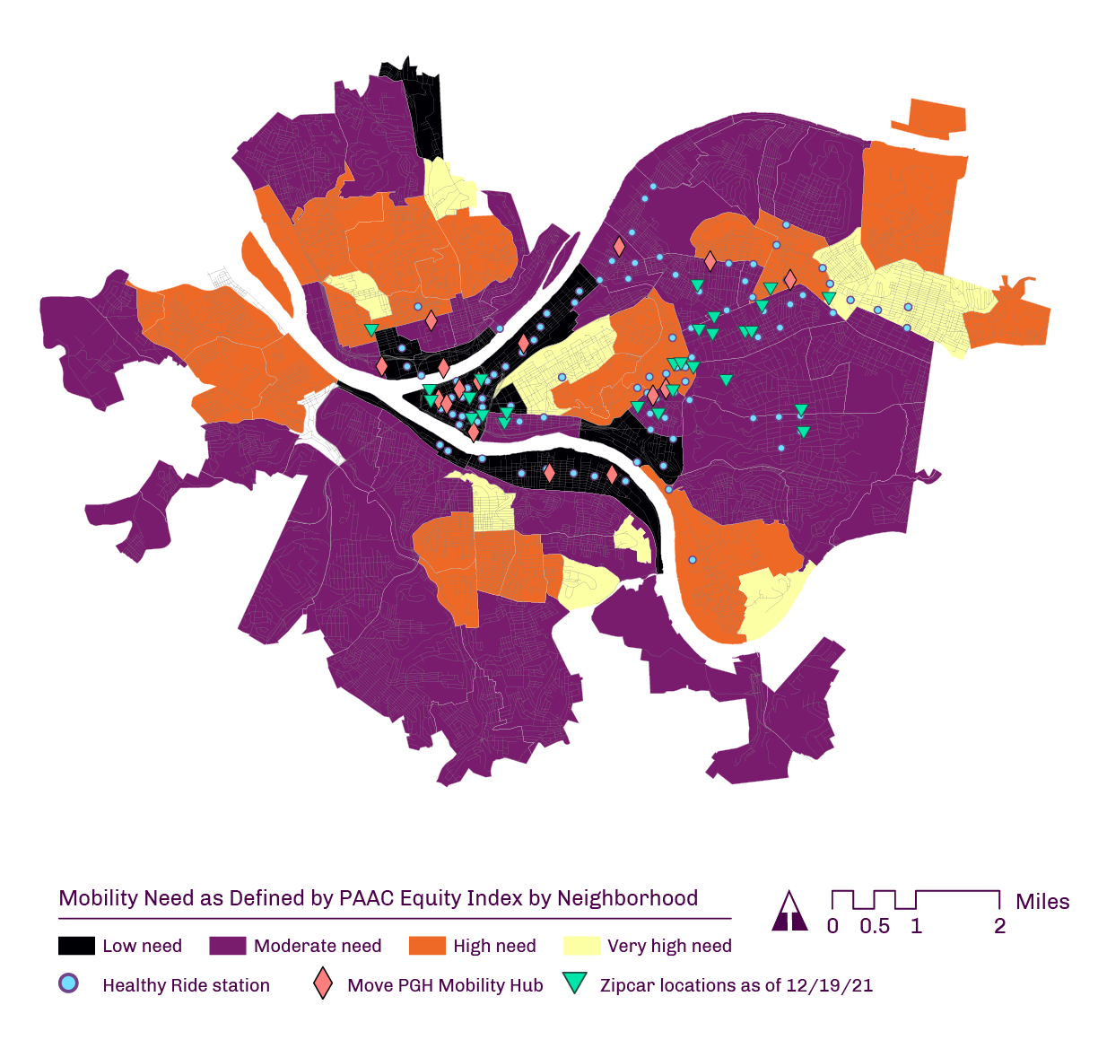 As co-author on a report︎︎︎ for the advocacy group Pittsburghers for Public Transit, I used ArcGIS and public data to explore if the City of Pittsburgh’s recent investments in high-tech micromobility was serving residents with the highest mobility need.
